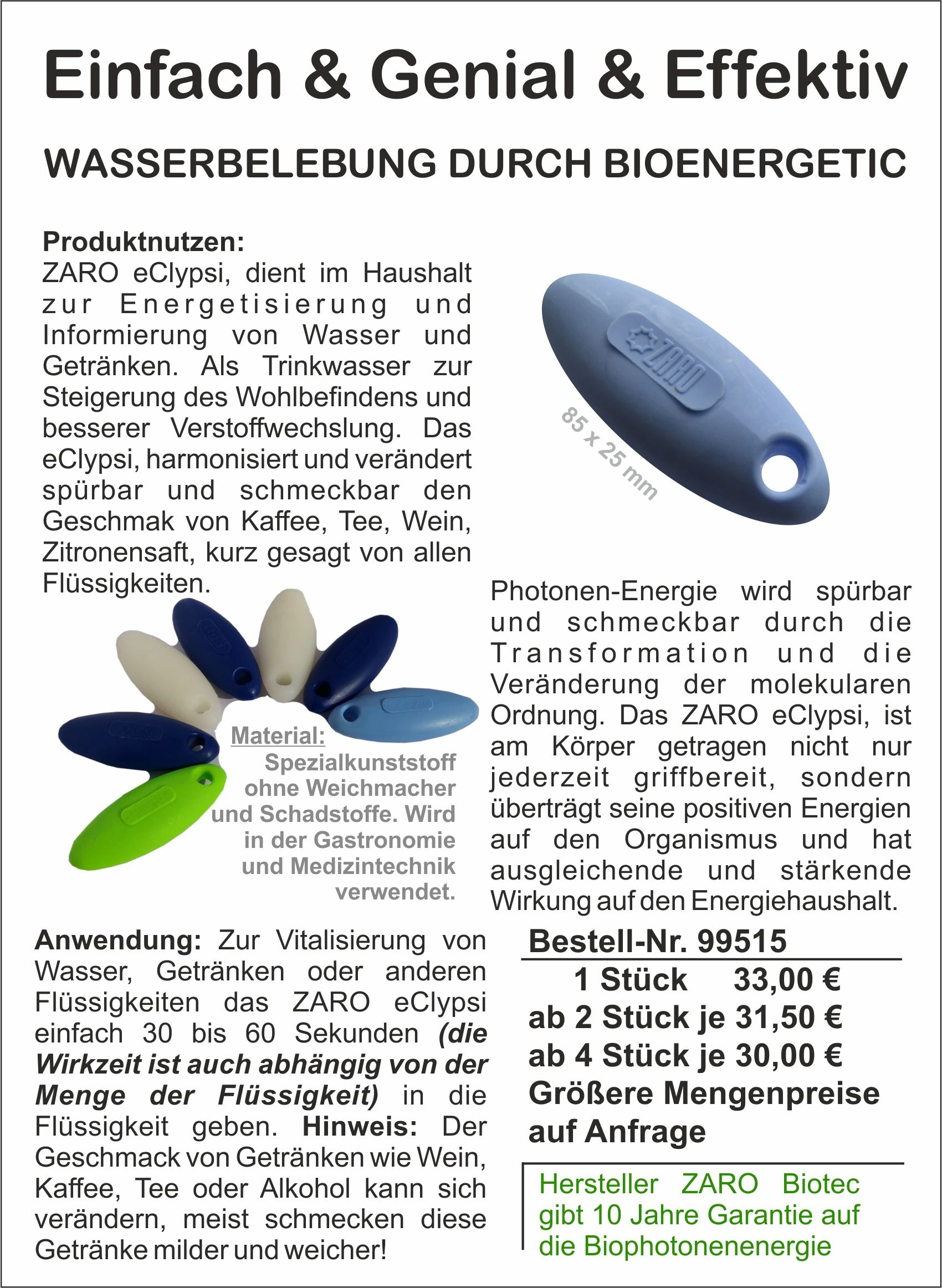 Trinkwasser:Energetisieren Sie Ihr Trinkwasser (am besten Leitungswasser), indem Sie den eClypsi einfach in das Wasser für eine kurze Zeit von ca. 30 – 60 Sekunden eintauchen. Sie werden den Unterschied schmecken und merken. Das Wasser schmeckt einfach besser, angenehmer und wird bekömmlicher.