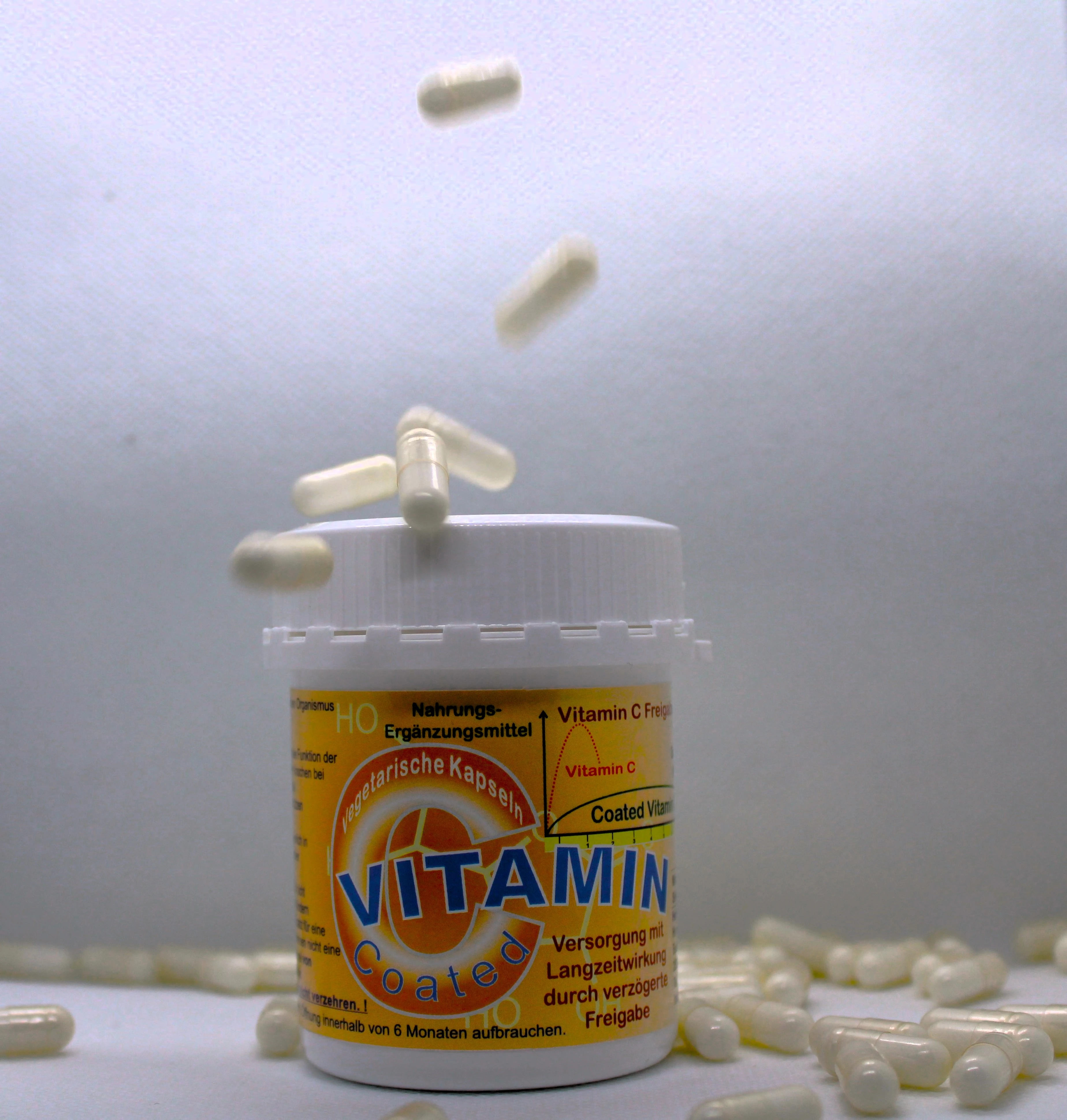 Eine Kapsel enthält 500mg Vitamin-C coated mit Langzeitwirkung