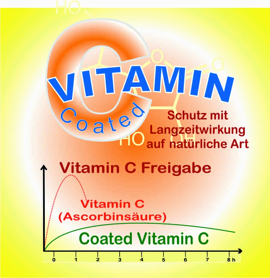 Vitamin C ist der wichtigste Radikalfänger im wässrigen Milieu unseres Körpers! Da unser Körper zu ca. 60% aus Wasser besteht, haben wir einen besonders hohen Bedarf an diesem wasserlöslichen Vitamin. Es ist in unserem Körper an einer Vielzahl von Stoffwechselprozessen beteiligt. Die Wichtigkeit von Vitamin C für unser Abwehrsystem ist allgemein recht gut bekannt. Bereits Linus Pauling, Chemie Nobelpreisträger 1954, erahnte diese Wichtigkeit und nahm täglich ca. 18 Gramm Vitamin C zu sich. Vitamin C ist unentbehrlich für die Abwehrstärkung und Immunstimulation, das Hormon- und Nervensystem, die Regulation des Fettstoffwechsels, die Anregung des Entgiftungssystems, die Bildung und Funktionserhaltung von Knochen und Bindegewebe sowie die Beschleunigung der Wundheilung. Um eine stetige Schutzversorgung des Körpers zu erreichen, müssten wir mehrfach täglich Vitamin C zu uns nehmen. Unsere Vitamin C Langzeitkapseln sind ummantelt (gecoated) und sorgen für eine langsame Freigabe über 5-8 Stunden.