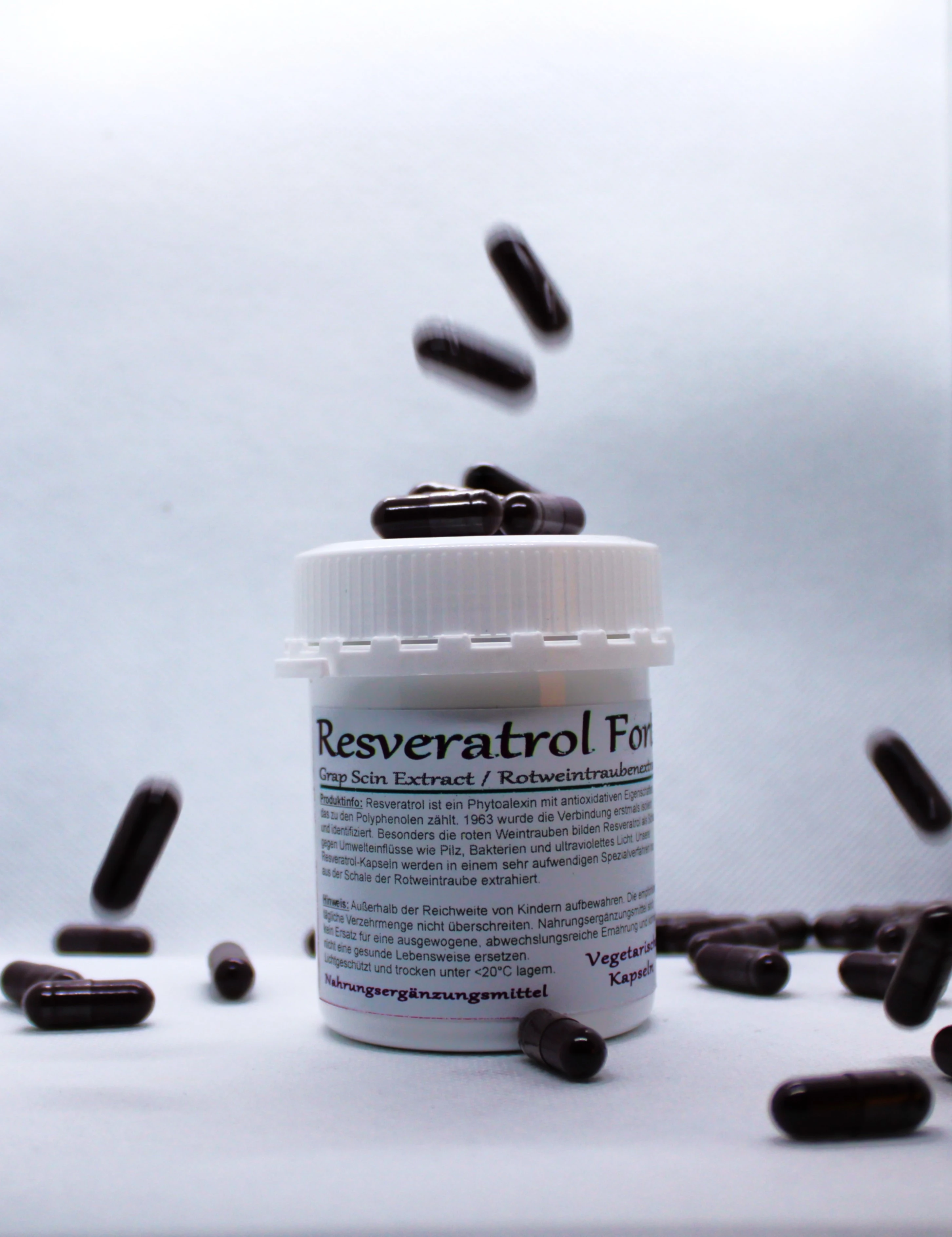 Eine Kapsel enthält 400mg reines hochwertiges Resveratrol aus der Schale der roten Weintraube.